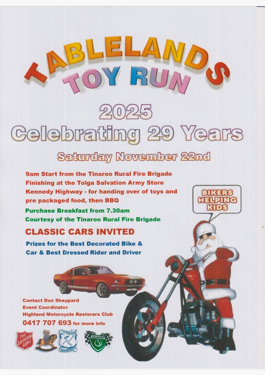 Return to Events Tablelands Toy Run 10 Views 0 Comments Share 22 November 2025 730 am 12.30 pm TINAROO, QLD View Map Bring a toy, dress up as santa & ride your bike in, all cars & bikes welcome ! food & drinks available for purchase. Save to Calendar Sponsored EventShannons Attending