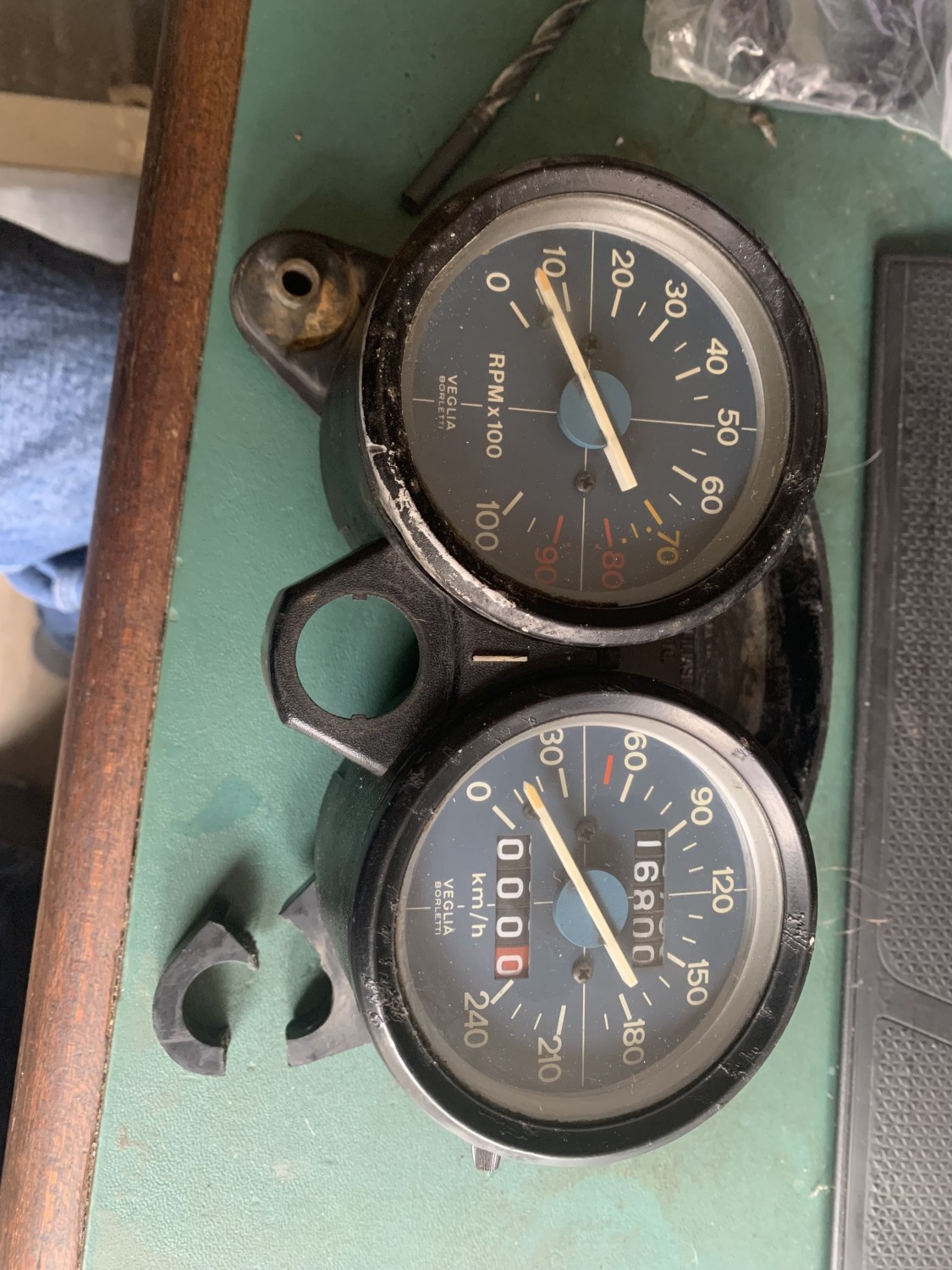 V65 speedo and tachometer. Not the right ones for a GT but will work until I can find the right ones. Speedo was rattling which didn’t fill me with confidence but it just had an old light bulb inside. Span them up with a drill they seem to work which is a relief since the pair were north of $400 including shipping. The drive cables are still on their way. I think I might carefully remove the paint and polish the aluminium so it fits a bit better with the other mods. Veglia dials remind me of the Alfetta GTVs of my youth, same colour faces!